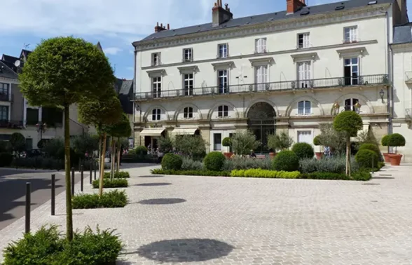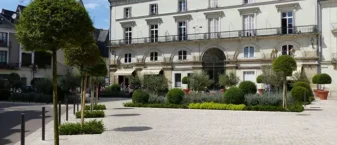 Cette conception originale (Philippe Herlin, paysagiste), composée de manière à permettre les rassemblements évènementiels, s’est appuyée sur la grande façade italianisante du bâtiment principal de cette place. C’est ainsi que naissent des bouquets d’oliviers, des topiaires de troènes à petites feuilles en boules de différentes hauteurs, accompagnés de potées plantées. En strate basse, des agapanthes bleues ainsi qu’un cortège de plantes annuelles plantées en lignes bleues et blanches apportent une tonalité rafraichissante à cette place jardin.