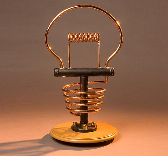 Le filament d’ampoule est un travail de cours réalisé par un jeune plombier chez les compagnons de ce métier. Les tubes de cuivre cintrés et spiralés sont montés sur des tuyaux en acier.