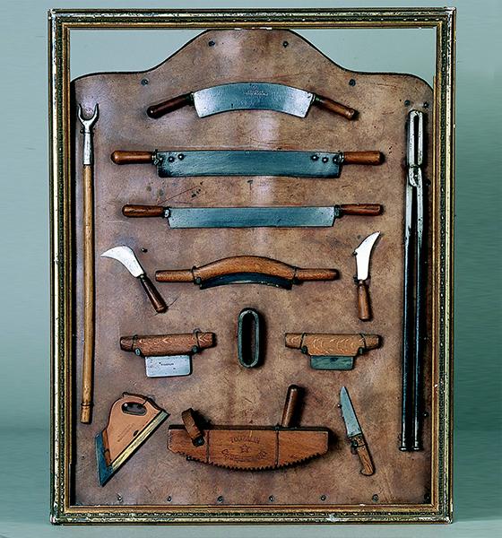 Des panoplies d’outils miniatures étaient parfois confectionnées par des taillandiers. Celle-ci présente l’outillage des tanneurs et des corroyeurs et a été réalisée au début du XXe siècle par la maison Touzalin, de Château-Renault (Indre-et-Loire), qui était la « cité du cuir ».