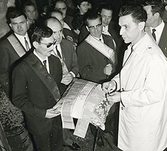 Roger Lecotté et Jean Royer inaugurant le musée du Compagnonnage en 1968 Il en sera ainsi durant quelques années, avant que l’aménagement du chauffage permette une ouverture continue au public.