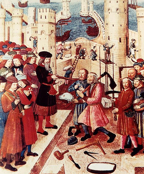 1480 : une enluminure de Guglielmo Caorcino représente le siège de Rhodes par les Turcs. Pour les empêcher d’envahir la place-forte, les ouvriers s’affairent à consolider les murailles. Derrière les remparts, le grand maître de l’Ordre des Chevaliers de Jérusalem et ses chevaliers reçoivent un groupe de charpentiers et de tailleurs de pierre tenant un outil à la main. Le grand maître pose son bâton sur l’épaule d’un charpentier, un autre s’agenouille, d’autres ouvriers s’avancent vers les chevaliers. Un charpentier et un tailleur de pierre ont la tête ceinte d’un ruban. S’agit-il de « couleurs », comme les ont porté jusqu’au début du XXe siècle les compagnons charpentiers et les tailleurs de pierre, enroulées autour de leur chapeau ?