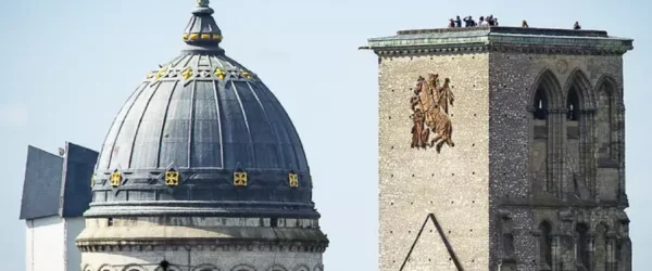 La tour de l’Horloge (50m) faisait partie de la façade principale, tandis que la tour Charlemagne (56m) était le clocher porche du bras nord du transept. L’étendue de l’ancienne collégiale est matérialisée par les deux tours, entre lesquelles se développait la nef. Le marquage des piliers sur la chaussée témoigne des dimensions de l’édifice, qui fut l’une des plus grandes églises de pèlerinage de la chrétienté.